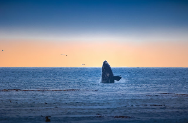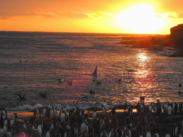 Magnifique levé de soleil sur la Baie du Marin. L’heure du petit-déjeuner pour un jeune adulte orque et l’escouade de pétrels géants qui compte bien s’en accaparer quelques reliefs.