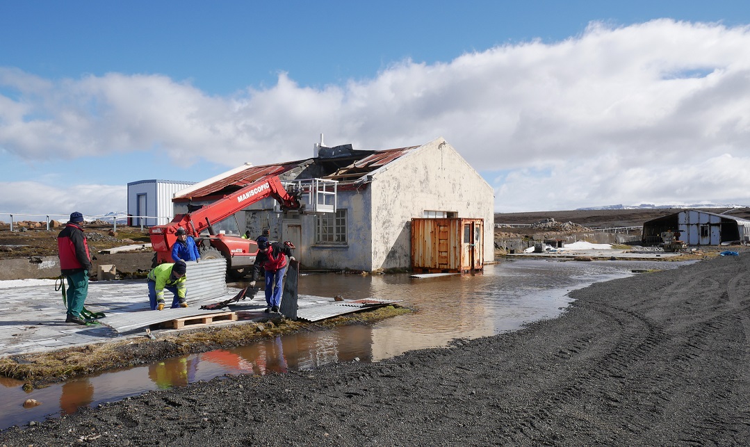 Coup de vent sur #Kerguelen. Le bâtiment B5 ne survivra pas à la dernière tempête. L'équipe infrastructure des #TAAF a entrepris le démontage de sa toiture fragilisée, en attendant son démantèlement complet dans le cadre de la réduction des emprises humaines au sein de la Réserve pic.twitter.com/2UTUzcHMWq