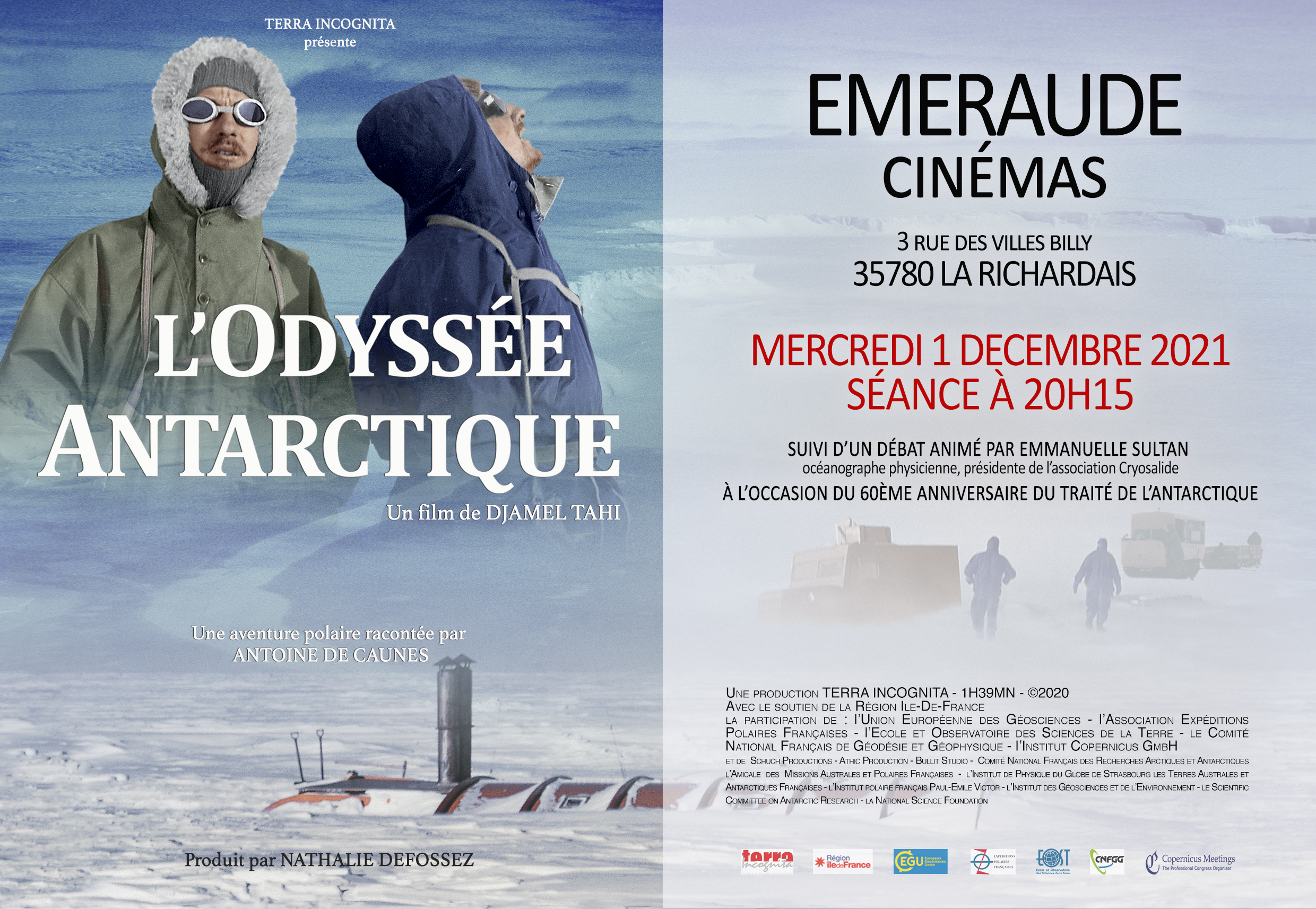 À l’occasion du 60ème anniversaire de la mise en œuvre du Traité de l’Antarctique, projection de L’Odyssée Antarctique, le nouveau film du réalisateur Djamel Tahi. Emmanuelle Sultan, présidente de Cryosalide et Océanographe spécialisée des régions polaires, animera le ciné-débat.