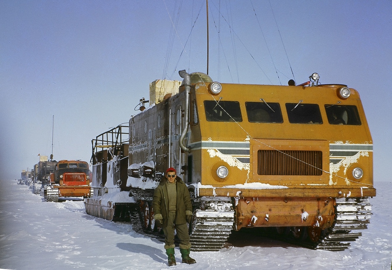 (Complément d'information par Elisabeth Porteneuve, le 14/12/2018) Jacques Bulle au cours du raid qu'il effectua avec les soviétiques en 1964 vers la station antarctique de Vostok.