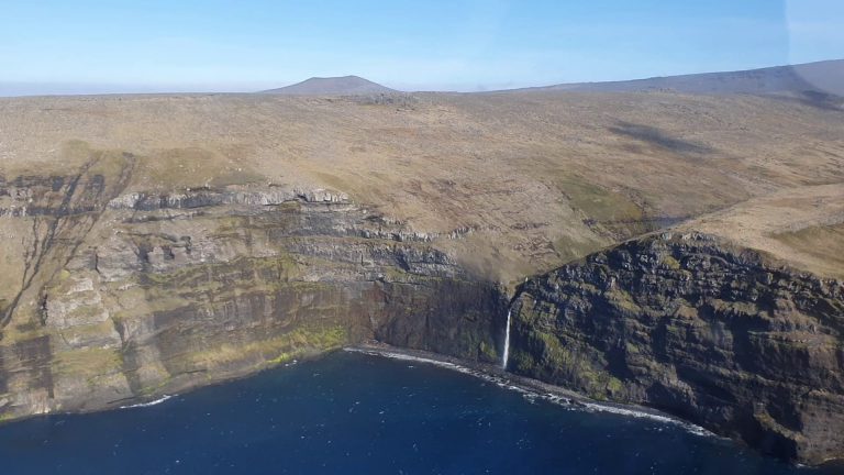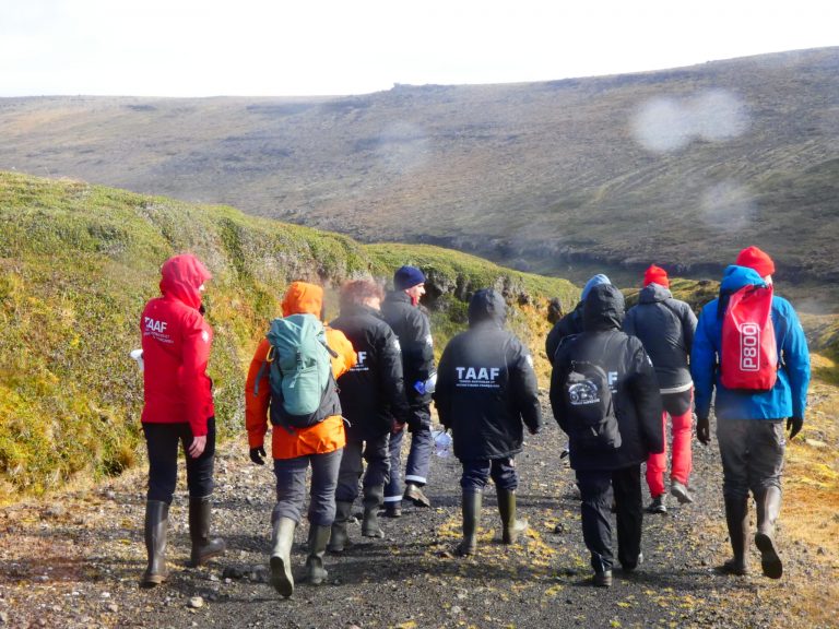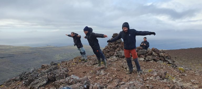 Après un nouveau repas de roi, nous sommes une bonne dizaine à partir à l’assaut du mont Branca, 383 m dans les scories volcaniques. Le vent nous brasse fort. Certains jouent avec sa puissance dépassant largement 100 km/h. Paysage minéral grandiose, parsemé de touches vertes, des azorelles, comme des mousses dont la croissance est très lente et qu’il ne faut pas piétiner. On ne tarde pas trop à retourner sur base pour ne pas rater l’hélico de retour, dont l’horaire peut changer en fonction de l’évolution de la météo.