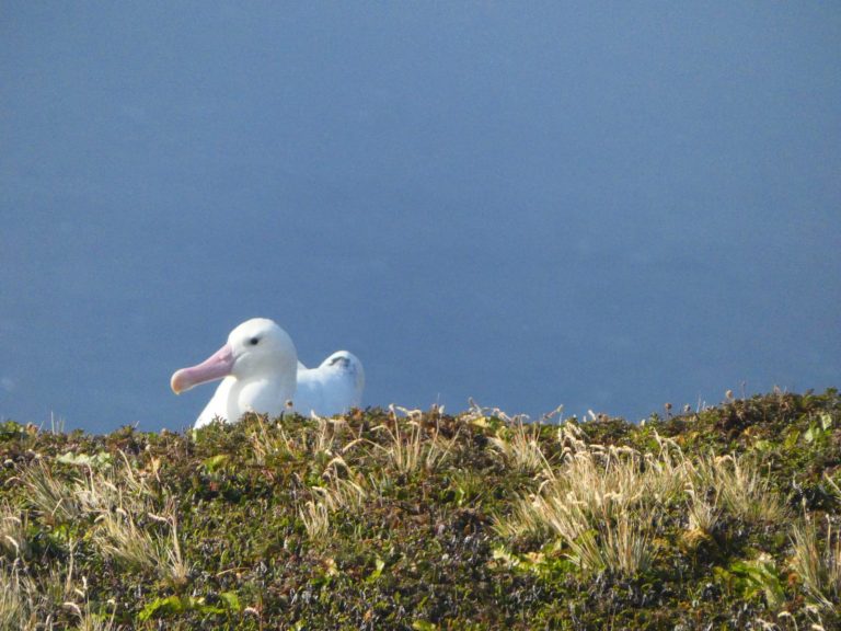 Mardi matin, après 2 heures à La Résidence (le bâtiment du Discro) pour consulter des archives de la base, en vue de « peaufiner » l’annuaire historique des missions de 1950 à 2000 (autre projet de l’amicale), je descends avec un autre Yann à Bollard, un lieu-dit dominant la baie du Marin, dans une zone de végétation fragile où le chemin est équipé de caillebotis. On observe, à bonne distance, nos premiers albatros au nid. En contrebas, la manchotière de la baie du Marin se fait entendre entre deux rafales de vent.
