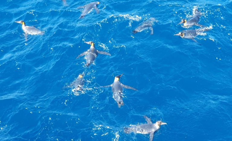 Lundi 7 avril, midi, arrivé devant l’île de la Possession, le Marion Dufresne doit se déplacer en Baie Américaine, car la houle forte en baie du Marin, devant la base Alfred Faure, ne permet pas à l’hélico, qui doit déjà affronter un vent soutenu, de décoller. Les manchots royaux sont nombreux à marsouiner devant le Marion.