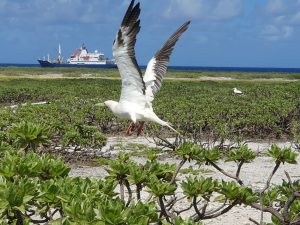 D’abord, cap au nord, par une mer calme. Arrivée à l’aube mardi 1er avril devant Tromelin, île de 1 km² faisant partie du cinquième district des TAAF, les îles Eparses, créé en 2007. Tromelin se trouve à 560 km au nord de La Réunion. Bien que disposant d’une piste d’aviation, celle-ci n’est plus utilisée depuis de nombreuses années, suite aux travaux d’éradication des rongeurs (rats en 2005, souris en 2023) qui ont permis une augmentation importante du nombre d’espèces d’oiseaux nicheurs, passées de 2 à 7 sur l’île, et du nombre de couples (5500). Tromelin est donc ravitaillée par bateau quatre fois par an et le personnel (4 agents) est relevé environ tous les 3 mois.