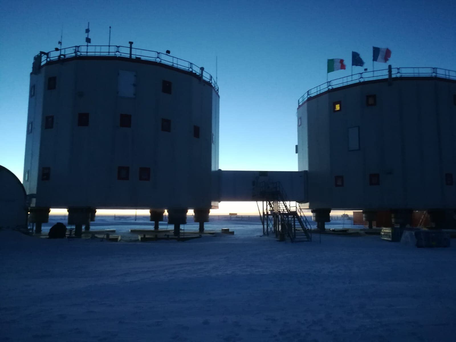 De plus, la base Concordia est composée de 2 bâtiments principaux reliés par un tunnel au niveau du 1er étage. Ils sont constitués d’une charpente métallique revêtue de panneaux très isolants (100°C d’écart entre l’intérieur et l’extérieur du bâtiment). Ces structures reposent sur des pilotis relevables par vérins hydrauliques qui permettent de compenser l’enfoncement progressif des bâtiments (15 mètres de haut au total en position haute). Durant cette période, elle peut accueillir une quinzaine de personnes contre une soixantaine durant l’été.