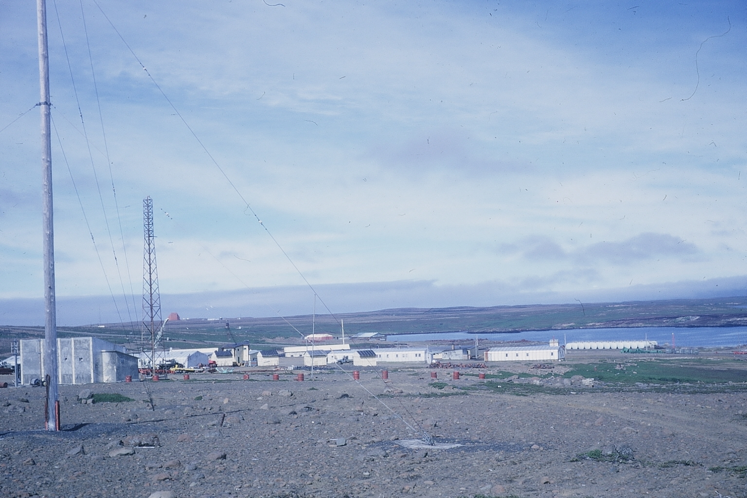 Le GALLIENI glisse sur une eau calme et longe "l'île de la désolation". Pas un arbre en effet, de grandes plaines recouvertes de cailloux, des parois verticales, et une couleur mystérieuse qui tire vers le noir. Quand le bateau est entré dans la Passe Royale, le Ross tout blanc se détachait dans un cadre et un ciel d'encre et accrochait l'oeil; c'est lui que je vis en premier. Puis sur la droite, bien blotti des taches blanches, une forêt d'antennes (la seule de toute l'île) : Port aux Français.