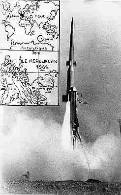 Pour mieux comprendre le choix de KERGUELEN pour cette Campagne, il faut savoir que l'Archipel présente l'avantage d'avoir un point continental magnétique conjugué (sur une même ligne de force du Champ magnétique Terrestre), qui se trouve à SOGRA en U.R.S.S., et que la possibilité de mesures parallèles en ces deux points facilite beaucoup l'étude et la connaissance des phénomènes. C'est dans ce but que, depuis trois ans, se font en permanence des expériences et des mesures au sol. Mais, pour diverses raisons, ces mesures ne donnent pas entière satisfaction. Cela a motivé la mise au point d'une campagne de Fusée Sondes, permettant de faire des mesures plus riches et plus précises, indépendantes de l'absorption ionosphérique très mal connue, et perturbant les mesures au sol. Dans ce dessein, il fut choisi d'opérer dans trois phénomènes connus : l'Aurore, le Souffle, le Choeur de l'Aube; chacun se manifestant par une émission T.B.F. propre et reconnaissable.