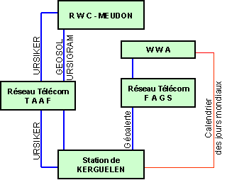 Le schéma ci-joint, très sommaire, situe assez bien la station de Kerguelen dans son contexte. Il faut remarquer toutefois qu'il n'intéresse que des phénomènes solaires, ou produits dans l'exosphère. Un réseau analogue, mais moins complexe, serait à décrire pour la sismologie.