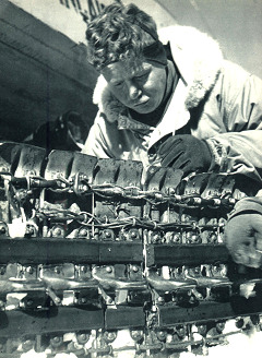 L’atterrissage sur le terrain de Keflavik a lieu à 0h10 le 13 juillet. Après une restauration rapide, le chargement de l’appareil se poursuit avec une attention particulière à la répartition des charges. Loubry et Comet ont déposé le plan de vol. Impossible d’accrocher OYD (l’indicatif du convoi). 6h21 décollage après une autorisation de la tour bien particulière quant à la destination puisque celle-ci est inconnue ! Distance 1200 km, sans météo, sans radioguidage, altitude 12.000 pieds et toujours le black-out radio, le vol se poursuit. La côte est atteinte puis le désert blanc défile à 320 km/h sous les ailes de l’avion. A 8h15 il a effectué la moitié de son vol et toujours pas de contact radio. Le moteur 3 donne des signes inquiétants. Le visage de Loubry s’assombrit. « Fallou si dans cinq minutes nous ne les avons pas accroché nous faisons demi-tour ». Puis à 8h55 le convoi est en ligne. L’heure estimée est signalée à Rouet. « Donnez votre position » – « 70.22.50 Nord et 44.09.10 West » et Rouet rajoute « Nous ne vous attendions pas si tôt ». Rectification du cap, le contact est maintenu. Encore faut-il voir le convoi car le radioguidage est prévu pour station centrale et n’est donc pas opérationnel. C’est Rouet qui émet en permanence et l’avion qui utilise sa gonio. A 1000 m au dessus de la neige tout l’équipage scrute ce désert blanc. La gonio capte de faibles signaux qui s’amplifient. Fallou le radio indique la direction à prendre puis Loubry, un instant après, crie « LES VOILA ! ». Réduction des moteurs et piqué sur le convoi. Les fumigènes donnent la direction du vent et, à l’aide des weasels, les membres de l’expédition ont tracé la DZ. La porte est ouverte et le cockpit aussitôt rempli d’un courant d’air glacial. Les passages se succèdent et les colis s’éparpillent sur la neige. Ces largages ne durent que 20 secondes et un passage s’effectue toutes les 8 minutes. Le travail à bord ne consiste pas qu’à pousser le colis, encore faut-il, aussitôt chaque largage effectué, répartir les charges pour éviter un décentrage trop dangereux. Le largage des colis et celui des bombes ne pose pas les mêmes problèmes ! Le droppage terminé l’avion reprend de l’altitude pour le parachutage des chenilles. Puis le dernier passage s’effectue au ras de la neige (si bas qu’il est arrivé que des avions touchent la neige, un Nord 2501 a laissé toutes ses antennes en 1967) pour larguer le courrier et deux jerricans de vin barrés d’une bande tricolore. Le 14 juillet c’est demain ! Puis le passage traditionnel de l’au revoir avec battement d’ailes. L’opération a duré 1h50, le F-OAAD reprend de l’altitude, direction l’Islande.