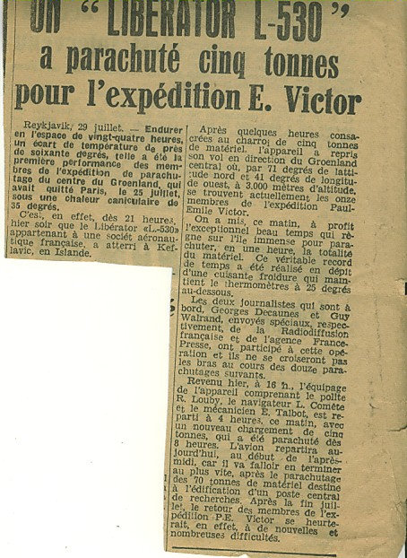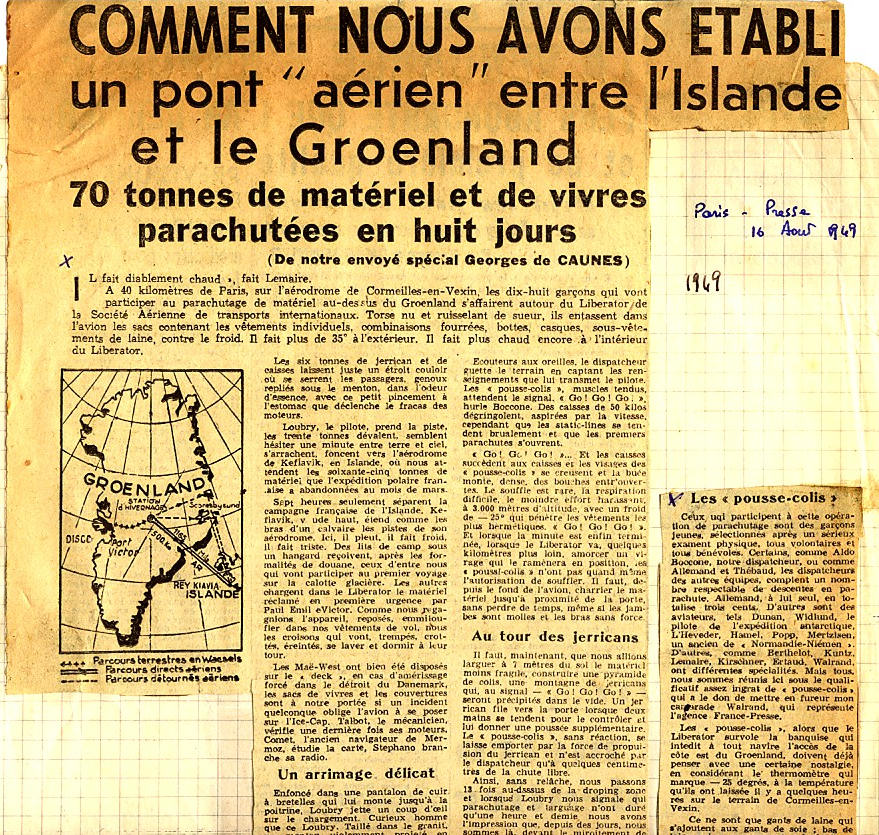Jean Combart et Roger Loubry, anciens navigants d’Air France, avaient fondé en 1948, leur propre compagnie : la SATI (1). Un des exploits de cette compagnie fut, en juillet 1949 de réaliser le ravitaillement de l’expédition au Groenland en larguant 80 tonnes de matériel en 13 missions.
