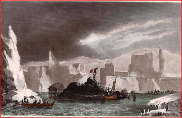 La première expédition antarctique française part de Toulon en janvier 1838, à la recherche du pôle Sud magnétique. À sa tête, le commandant Jules Dumont d’Urville à bord de l’Astrolabe, accompagné de la Zélée (commandant Jacquinot). Les deux navires sont des corvettes à voiles de 300 tonneaux. L’expédition explore la région en 1840 et reconnaît 150 milles de côte. Après avoir aperçu la côte le 20 janvier à 22 h 50, Dumont d’Urville fait mettre à l’eau deux canots, et les marins mettent pied, le 21 janvier à 17 h 30, sur le « Rocher du Débarquement ». Cet îlot est le plus élevé et le plus nord-occidental parmi le groupe d’îlots des îles Dumoulin, ainsi nommées par Dumont d’Urville en l’honneur de l’hydrographe de l’expédition Vincendon-Dumoulin.