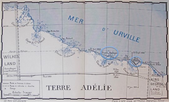 C’est finalement sous l’égide des Expéditions Polaires Françaises (EPF) créées en 1947 et dirigées par Paul-Émile Victor qu’ils s’embarquent pour construire la première base française en terre Adélie. Cette base construite en 1950 portera le nom de Port-Martin suite au décès soudain de J.A. Martin à bord du navire qui les amenait en terre Adélie.