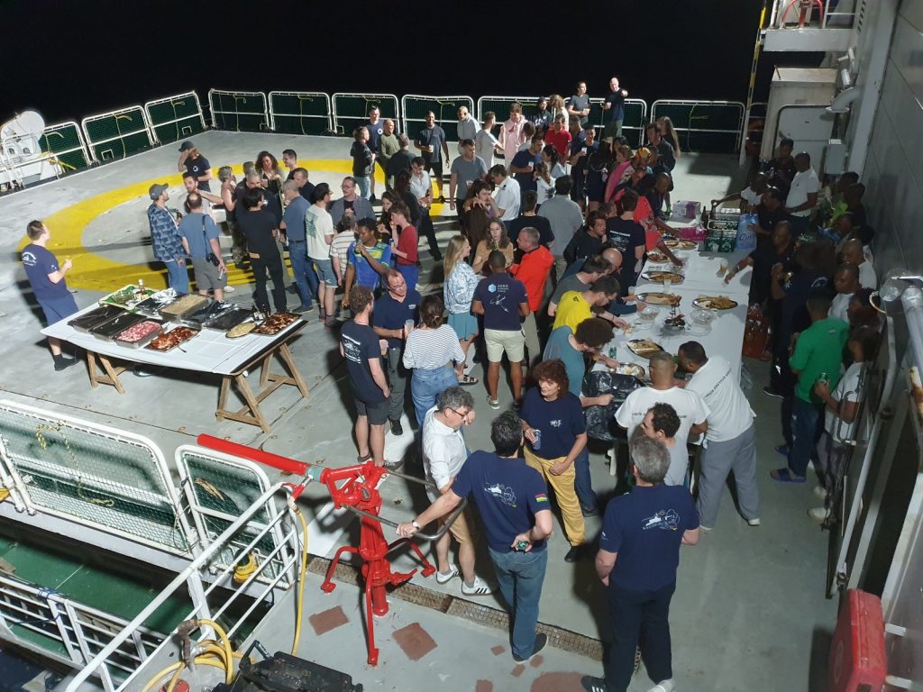 Détente de fin d’OP pour les personnels interdistricts IPEV ou des programmes soutenus par l’IPEV, de gauche à droite : Maxime, Romuald, Sarah, Brendan, Yann, Tanguy, Yann (à bord étaient également présents des Volontaires de Servie Civique sur des programmes IPEV, non présents sur la photo)