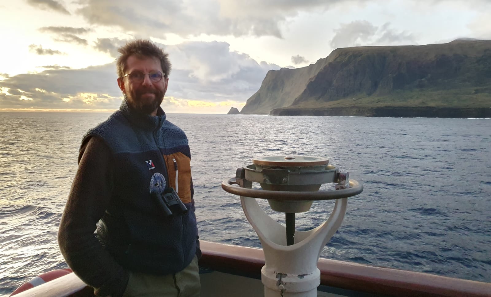 Lundi 21 avril, en fin de journée, le commandant donne l’ordre de faire le tour de l’île par l’ouest, par un temps idéal pour observer les grandes falaises sous le Mont du Fernand, et celles d’Entrecasteaux. Moment de grâce où le soleil du soir vient baigner d’une lumière chaude ces falaises dantesques, noires, brunes et vertes.